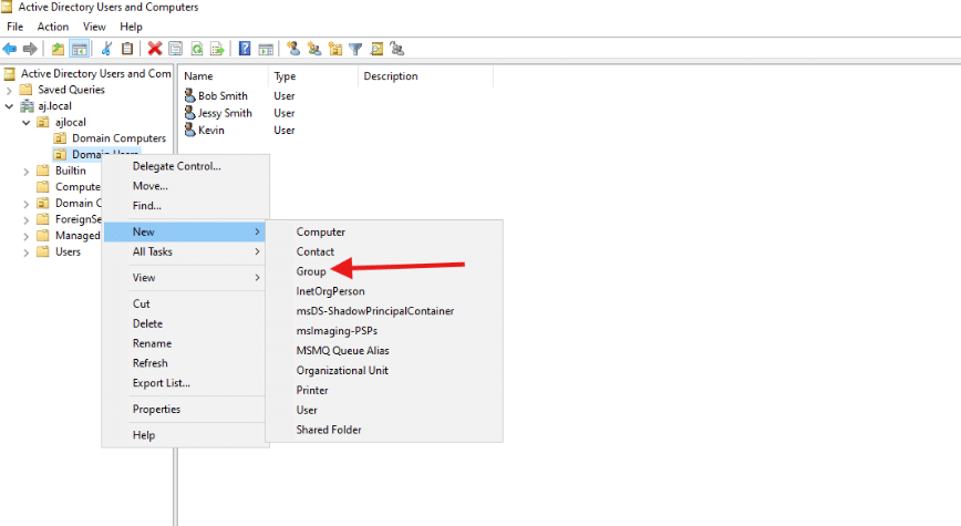 - In the console tree, right-click on the Organizational Unit (OU) or container (e.g., the ‘Users’ folder) where you want to create the new group.