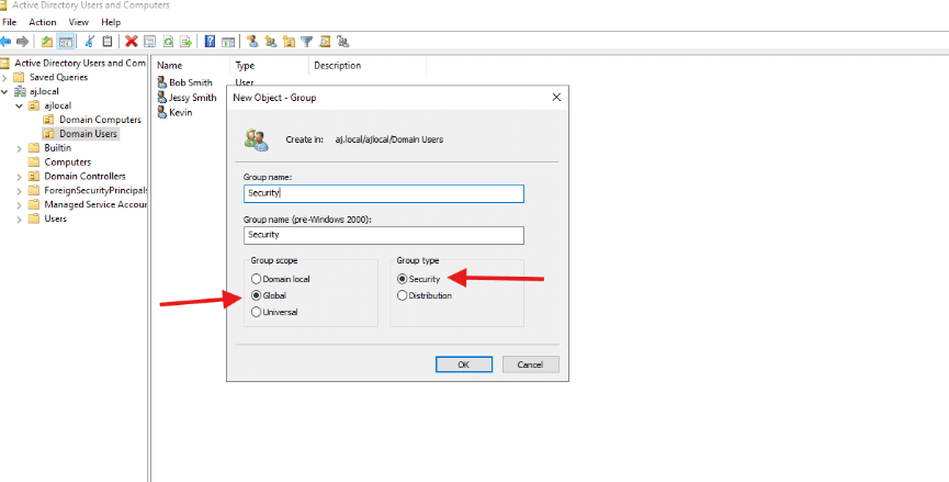 - Choose the appropriate Group scope: Global, Domain Local, or Universal.