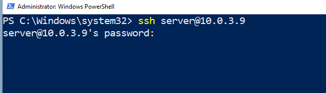 Now that our ssh is active let’s access it on our windows machine, Open powershell on windows and type ssh follow by the name the ubuntu server in my case is “server” and the IP address of the ubuntu server 10.0.3.9