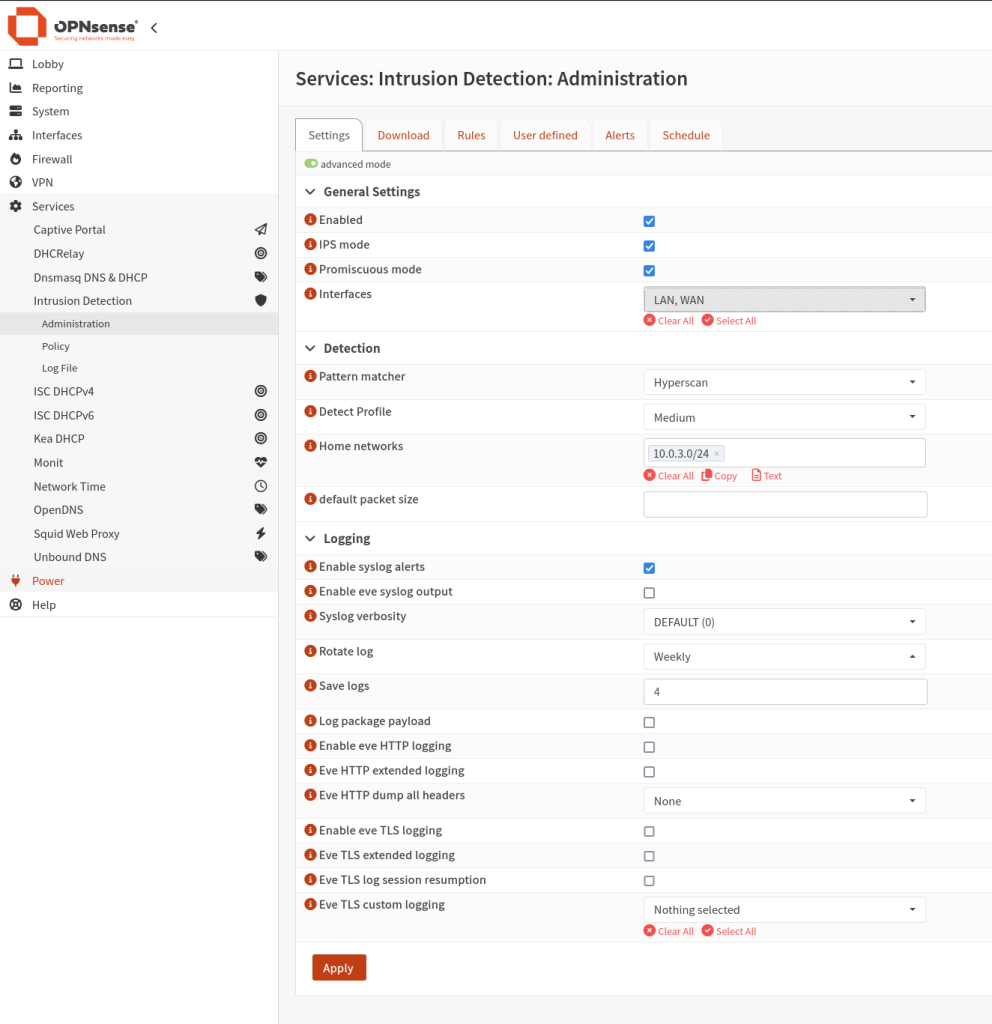 Before making any change you need to click the advanced mode button to view all settings, Next check the Enabled box, IPS mode, Promiscuous mode and the interfaces you can keep it to LAN only if you want but for this lab we’ll use LAN and WAN. Under Detection the pattern matcher should be “Hyperscan“, The Dectect Profile we will leave it to “Medium” because we do not want to have a massive amount of false possitives, on the Home networks we need to specify the subnet on our home network (LAN Subnet) is using, After everything is set click on Apply.