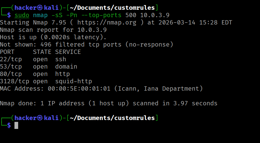sudo nmap -sS -Pn --top-ports 500 10.0.3.9