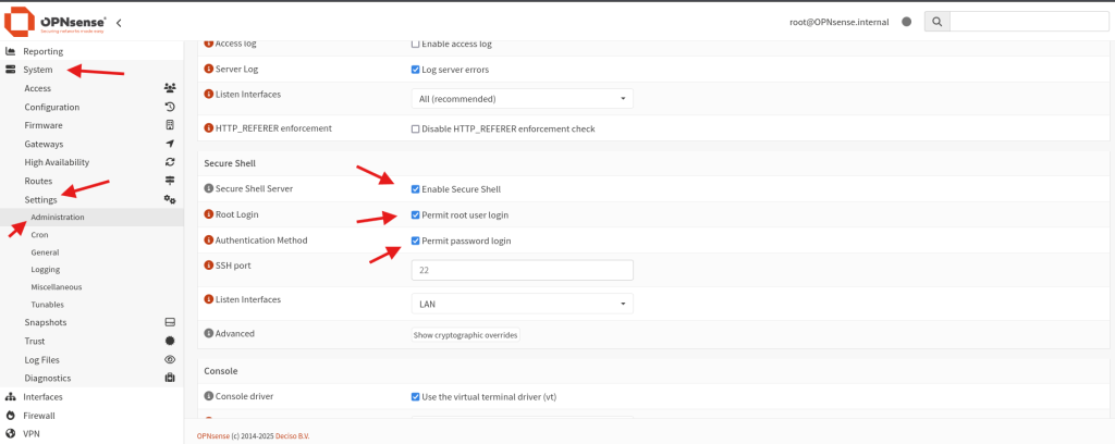 In order to create our custom rules we need to use ssh on our Opnsense but before that let enable this setting. Go to system then setting and Administration. Next enable secure shell, Permit root user login and Permit password login, And click save.