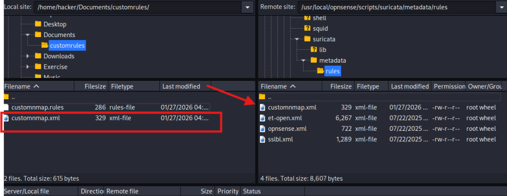 Now go to filezilla and locate where you created our custom rules in my case is on Documents. And on the Opnsense filewall we going to navigate to usr > local > opnsense > scripts > suricata > metadata > rules and we going to transfer our xml files here by Drag and drop.