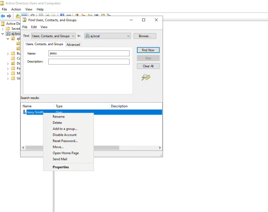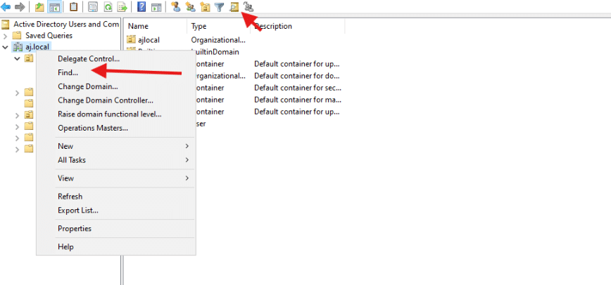 - Alternatively, you can right-click on your domain or a specific container (like an Organizational Unit) in the left-hand pane and choose “Find…” from the context menu.