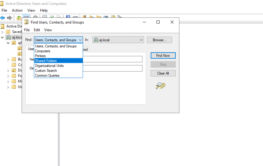 - In the “Find Users, Contacts, and Groups” dialog box, select the type of object you are looking for from the “Find” dropdown menu (e.g., User, Computer, Group).